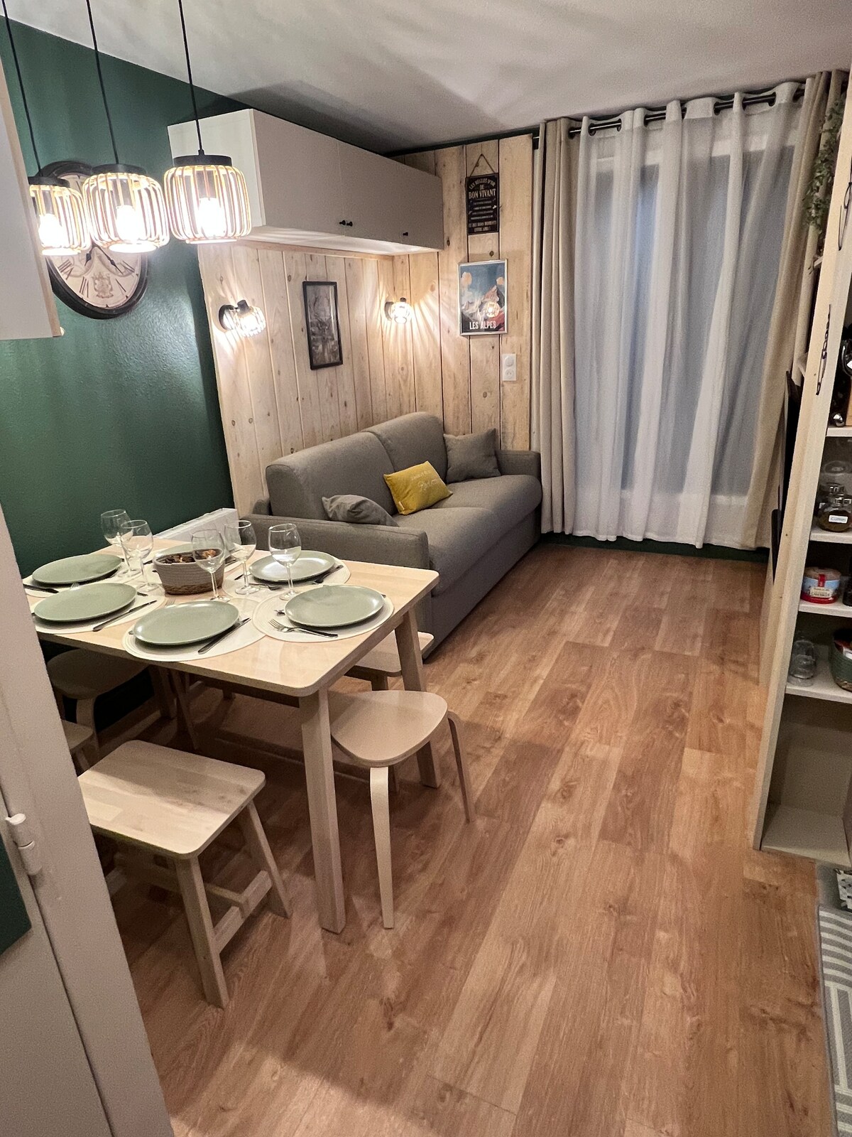Smukt 25 m2 stort studie, der er fuldstændig renoveret, ideel til 4 personer i hjertet af resortet Risoul residence le Villaret Et bjerghjørne med køjesenge En lys stue med en luksuriøs sovesofa Et moderne og fuldt udstyret køkken: opvaskemaskine, Ninja kombi, induktionskogeplade, emhætte Et badeværelse med stor bruser Sydvendt balkon Direkte adgang til skråningerne og landsbyens hjerte Vandreture starter ved foden af boligen Kælder til 2 mountainbikes Skiskab