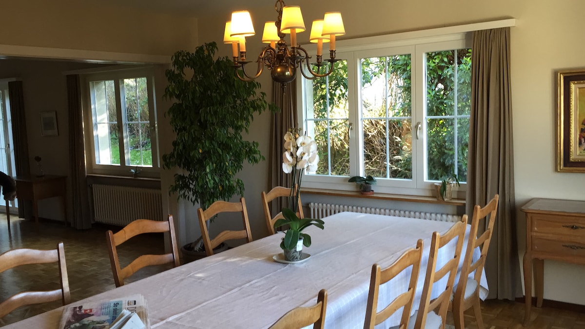 Large family home with a big fenced garden. Quiet location in a small village, half an hour from the heart of Zurich by car or train. Big reception area. The house sleeps 10 people. 1 master bedroom and 4 double bedrooms. 2 baths and 1 guest toilet.