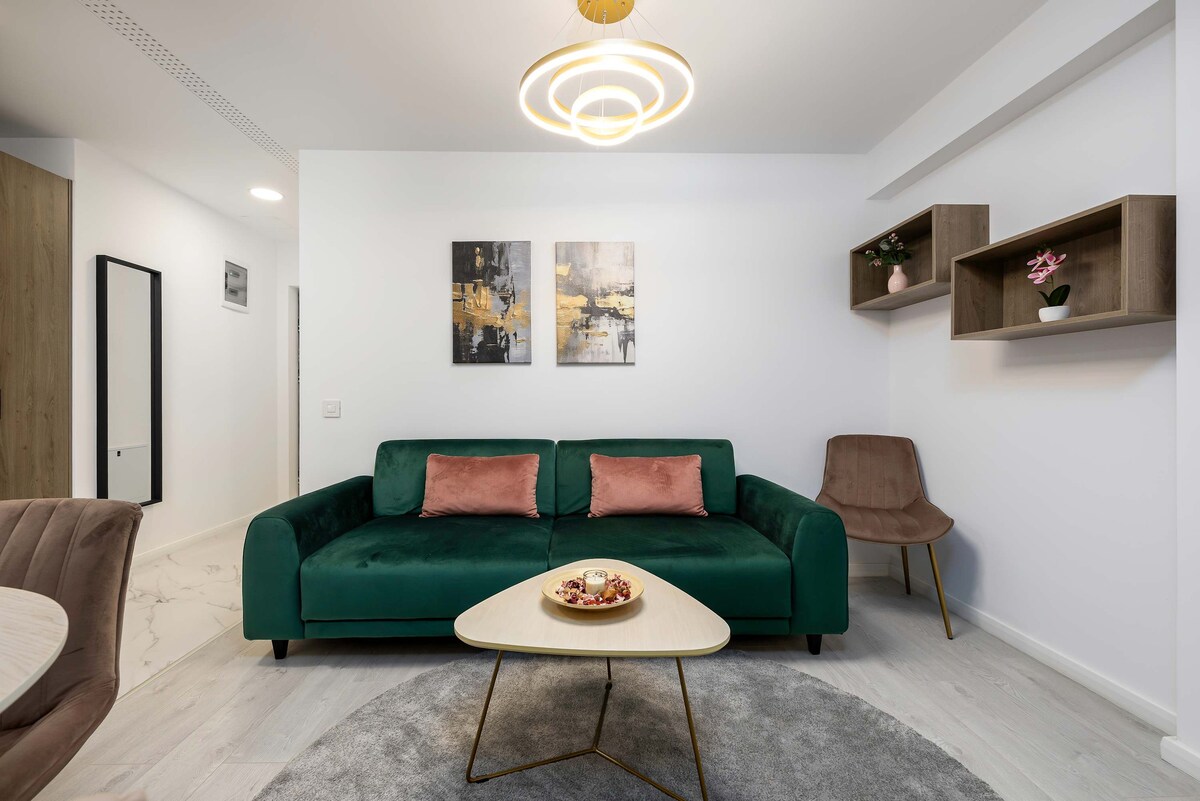 Selvom den ikke ligger i hjertet af byen, ligger denne stilfulde lejlighed i et af de roligste og sikreste områder i Bukarest, kun få skridt fra den smukke Moghioroș Park. Alt, hvad du har brug for, er i nærheden: supermarkeder, et indkøbscenter, restauranter og caféer – alt sammen inden for 5 minutters gang. Byens centrum, den gamle bydel og vartegn som Parlamentets Palads ligger kun 6 km væk i bil. Der er også nem adgang til offentlig transport, og der er en ny metrostation kun 5 minutter væk.