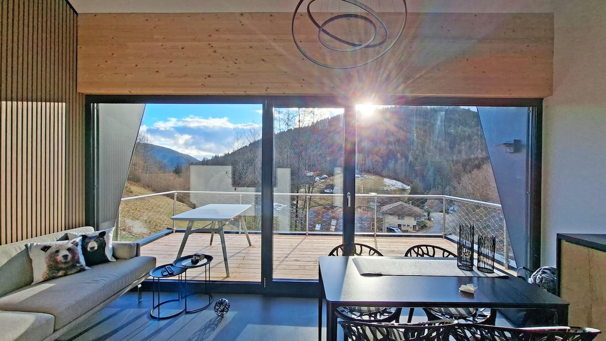 Slap af i denne særlige og rolige bolig. Nyd de smukke skove og den unikke udsigt fra altanen eller fra alle vinduer, meget lyst, nybyggeri. Gulvvarme i hele lejligheden og en brændeovn. Sofa til børn eller en ekstra person. I udkanten af en lille landsby. Naturvenligt grundstykke (4500 kvm) med mulighed for at grille og være udenfor på forskellige steder og bruge dem. Ved siden af feriehuset Schwäbischer Wald.