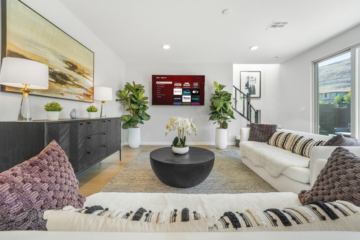 🌴 Long term visitors welcome! Private pool + spa (complimentary spa heating), cardio room, Samsung appliances, and modern upgrades throughout. Typically about 15–20 minutes to the Strip depending on traffic and destination. This 2400+ sq ft renovated home features one-of-a-kind furniture, an 8ft sparkling chandelier, marble-style flooring, and a 75-inch Samsung 4K TV! NOTE: This is NOT a party space. Please be respectful of the rules and the lovely neighbors.