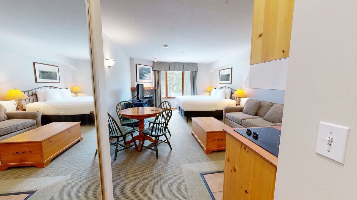 Welcome to #201 at the Hearthstone Lodge, a bright Queen Studio in the heart of Sun Peaks. Equipped with an efficiency kitchen, this studio has everything you need for a great stay. With great ski-in/ski-out, only a few steps from local restaurants, shops, and amenities. Parking is available on a first-come-first-save basis, for $20 p/n + tax. Plus, stay cool in the summer time with portable AC. *Please note that the patio area is not accessible during summer when the AC is installed.*