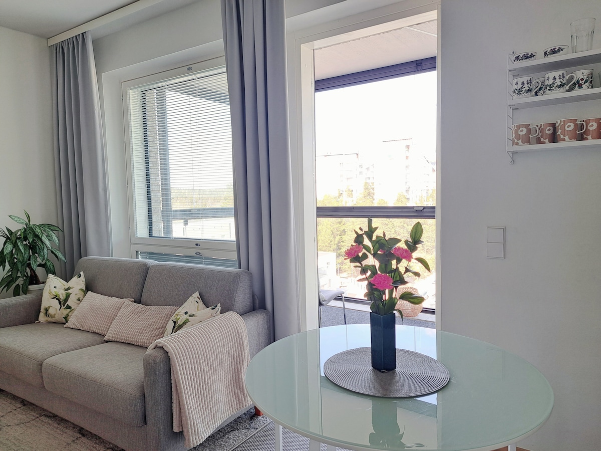 Stilfuld lejlighed lige ved siden af Lippulaiva indkøbscenter/metrostation (metro 27 min til Helsinki centrum). Udstyret til en meget høj standard med alt, hvad du har brug for til et afslappende ophold eller et arbejdsrelateret besøg. - 39 m2, opholdsrum med køkken, soveværelse, badeværelse og en rummelig balkon - ideel til 1-2 personer, kan rumme op til 4 personer - højhastigheds WiFi, TV - Indendørs parkering (spørg om pris) med nem adgang til lejligheden