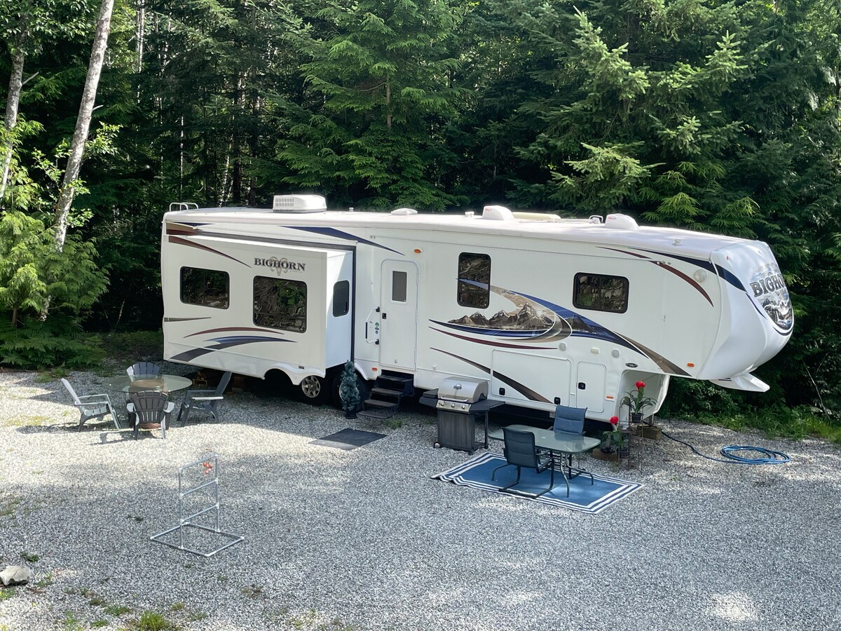 Self-contained 2 bedroom Park Model RV on private acreage in Garden Bay, Pender Harbour. I nærheden af Garden Bay Marine Park med jolledok, Garden Bay Lake og John Henry's General Store. Master suite med queensize-dobbeltseng på forsiden samt separat soveværelse bagved med køjesenge. Køkken og bad er fuldt udstyret med faciliteter, apparater, spisebord, stue med tv Netflix/Prime, stereoanlæg og sovesofa. Nyd solnedgange på den udendørs terrasse med grill eller brændeovn, når det er tilladt i henhold til lokale bestemmelser.