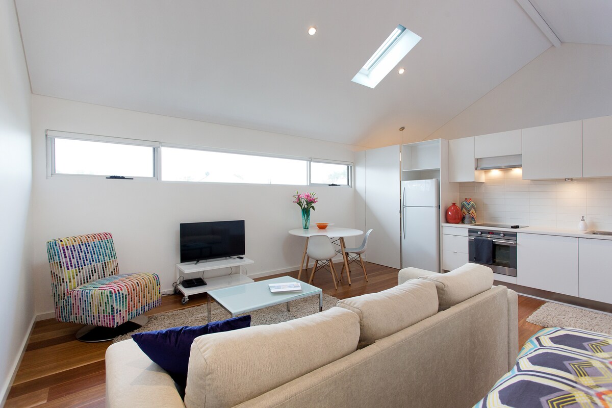 Fully self-contained, this modern and clean private accomodation is independent to a main home on a large block. Seperate access from the laneway, just minutes walk from the beach, train station and host of shops & cafes. Won't disappoint. Upto 3 guests (including any infants) permitted. Either a fold-a-bed or port-a-cot (including linen) will be provided for any additional guests (additional $15/night per additional bed)