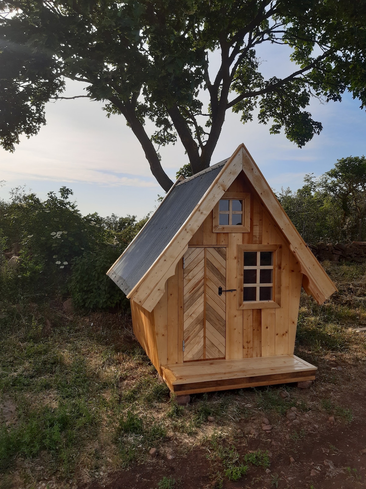 Smuk udsigt over marker og skove. Hyggeligt minihus med en seng/sofa, store vinduer. Fredfyldt atmosfære. Tørt toilet udenfor. Bruser i haven - et minibadekar med havevand (se billede). Elektricitet, men intet køkken. Lille vandkedel. Pejs udenfor, hvor du kan grille. Til en enkel ferie. Lille svømmesø 15 min gang.