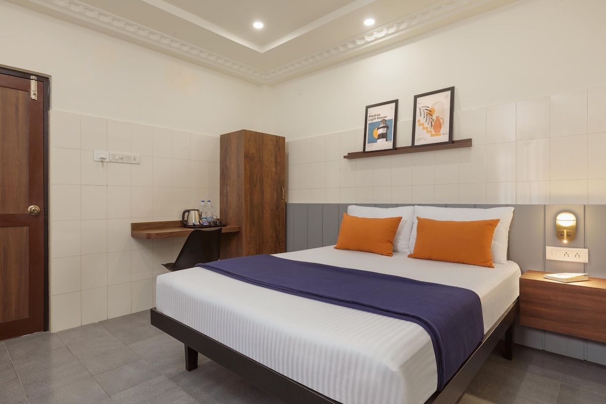 A cozy stay in the heart of Chennai in Nungambakkam. This 200 sq.ft room includes a comfy double bed, private bathroom, work desk, and a compact kitchenette. Located near Apollo Hospital, the American Embassy, Khadar Nawaz Khan Road, and T. Nagar, it's perfect for business travelers, medical visitors, and shoppers alike. Enjoy comfort, convenience, and easy access to Chennai’s key landmarks.