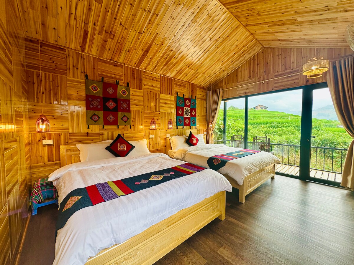 Oplev den sande ånd i Sapa, kun 10 km fra byens centrum – fredfyldt og omgivet af bjerge. * Separat træchalet for op til 3 gæster * Store glasvinduer med udsigt over bjerge og risterrasse * Fuldt udstyret køkken (køleskab og køkkenudstyr) * Pejs, varmeapparat og opvarmet madras (hyggeligt om vinteren) * Rummeligt moderne badeværelse med varmt vand og varme * Udendørs have med panoramaudsigt