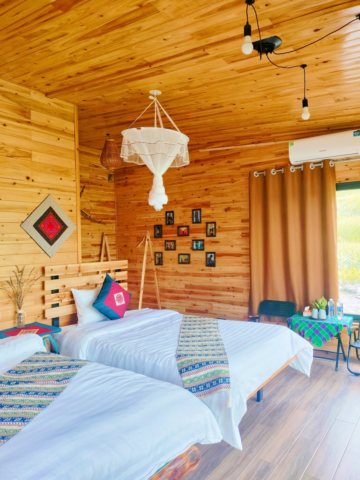 Vi har designet vores glade bungalow inspireret af et traditionelt Red Dao-hus (vores stamme) med en robust træramme, røde mursten og dyrebart træ. Glasåbninger under taget forbedrer det naturlige lys. Der er en dejlig mezzanin til ekstra madrasser, der er perfekt til glade børn eller venner. Alle møbler og dekorationer er håndlavede, og lyskæder skaber en hyggelig og fortryllende atmosfære. Nyd også dit eget private badeværelse lige ved siden af! #EnjoyHappiness 😁😁😁