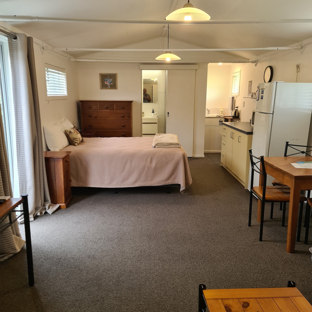 Nyindrettet atelier, beliggende tæt på Taupo by, gåafstand til butikker og restauranter. Helt indhegnet med parkering på gaden. Et aflåseligt rum til 2 cykler. Vores hyggelige og selvstændige lejlighed er hyggelig, når du vil blive hjemme, og nem at komme tilbage til, når du har været ude at se på seværdigheder eller har været ved søen eller de varme pools. Varmepumpen og vinduerne med termoruder holder dig varm om vinteren og kølig om sommeren. Der er alt, hvad du har brug for her til et godt ophold i vores dejlige by.