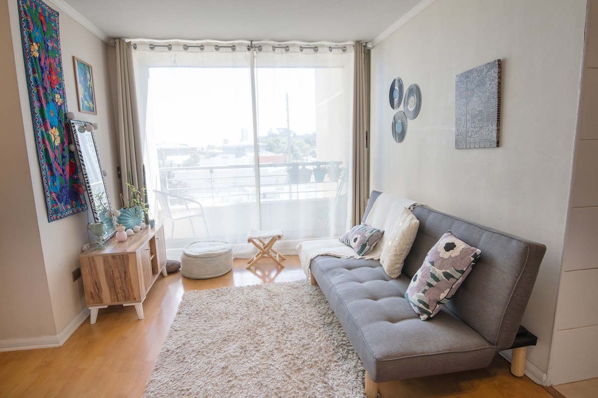 Dit perfekte ophold i Concepción. Moderne 1-værelses lejlighed, ideel til rejser, arbejde eller et hurtigt mellemlanding. Kun 5 minutter fra lufthavnen og 3 minutter fra indkøbscentret. Sikkert og roligt beboelsesområde. Nyd komfort, stil og alt, hvad du har brug for til et godt ophold. 🛏️ Dobbeltseng + enkeltsovesofa 🌇 Privat terrasse Adgang til🏋️ fitnessrum og vaskeri 🚗 Gratis parkering 📡 Hurtig wi-fi + tv 🍳 Fuldt udstyret køkken Book nu, og føl dig hjemme!