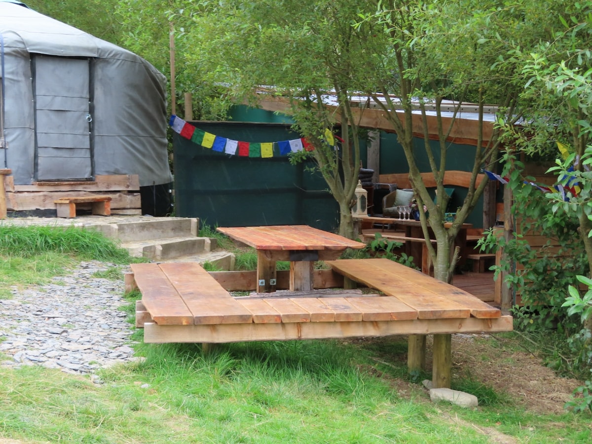Vores fuldt isolerede, traditionelle mongolske jurte ligger blandt vilde engblomster i sin egen private indhegnede have med kompostering øko toilet, urinal, varm bruser, brændeovn og bålplads med grill. Fuldt udstyret køkken med varmt og koldt vand, morgenmadsbar, spisebord og chill-out-område. Udendørs siddeområde med fantastisk udsigt over Cader Idris. Perfekt til familiegrupper.