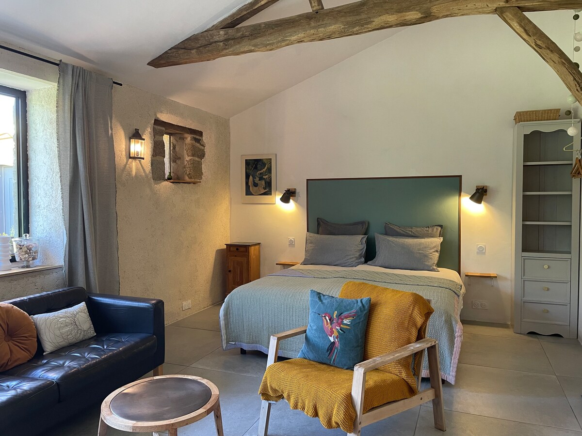 Komfort og fred midt i naturen. Vi glæder os til at byde dig velkommen til en rummelig 27 m2 stor lejlighed, der støder op til et nyt hus på en ejendom på landet. Bestående af en stue med en behagelig sofa samt et køkken, har du adgang til et soveværelse med tv og et badeværelse. > NY madras med fast støtte 23 cm tyk (marts 2025) > Idriftsættelse af det reversible klimaanlæg i december 2025 > Gratis adgang til Canal+ på tv i soveværelset