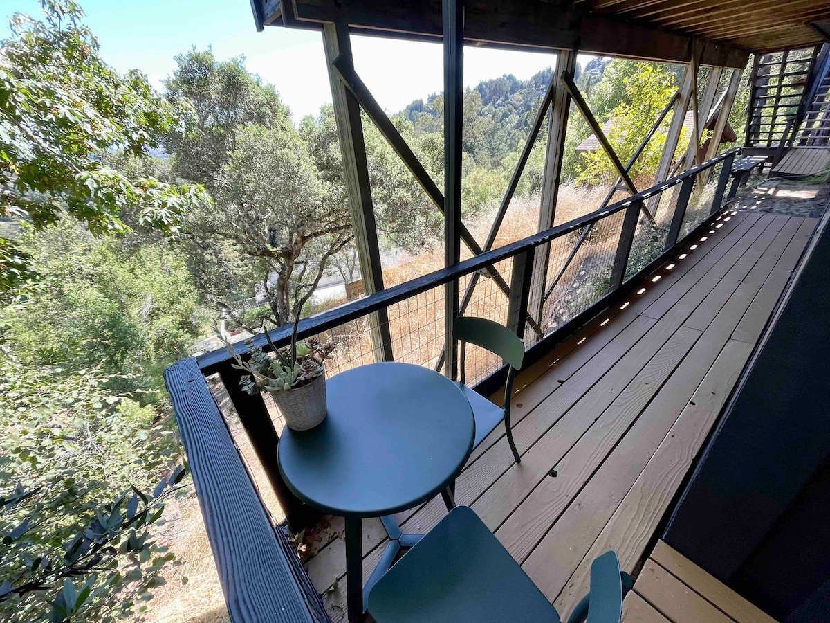 Åben for natlig udlejning! Tæt på Golden Gate Bridge og Muir Woods i magiske Mill Valley. 400 kvadratmeter + stort dæk af en velindrettet lejlighed i Tam Valley og med fantastisk udsigt. Inkluderer soveværelse (king) med franske døre, stue med udtrækssofa, en overdækket terrasse og madlavningsområde (se noter). Slap af, når du ankommer, med en god bog fra vores bibliotek, og slap af på terrassen med udsigt over de mange bølgende bakker i vores betagende og vilde nabolag. :)