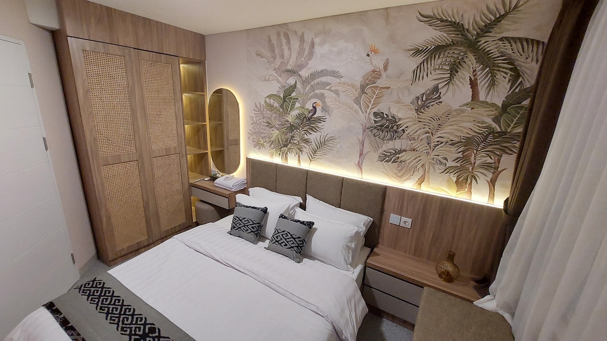 Splinterny 1BR (ikke et atelier) Japandi-stil lejlighed (35 m²) med udsigt over byen, beliggende over K Mall på Menara Jakarta, kun 150 m eller 5 minutters gang til JIExpo Kemayoran. Beliggende i det centrale Jakarta, 11 minutter til JIS, 20 minutter til Grand Indonesia og 5 minutter til betalingsvejen. Har en queensize-seng (160×200), 2 klimaanlæg, wi-fi, tekøkken, 50" Google TV, vandvarmere og vaskeri. Nyd pool, fitnessrum, lounge, kontorfællesskab, sportsbaner og legeplads for børn. Ideel til to gæster.