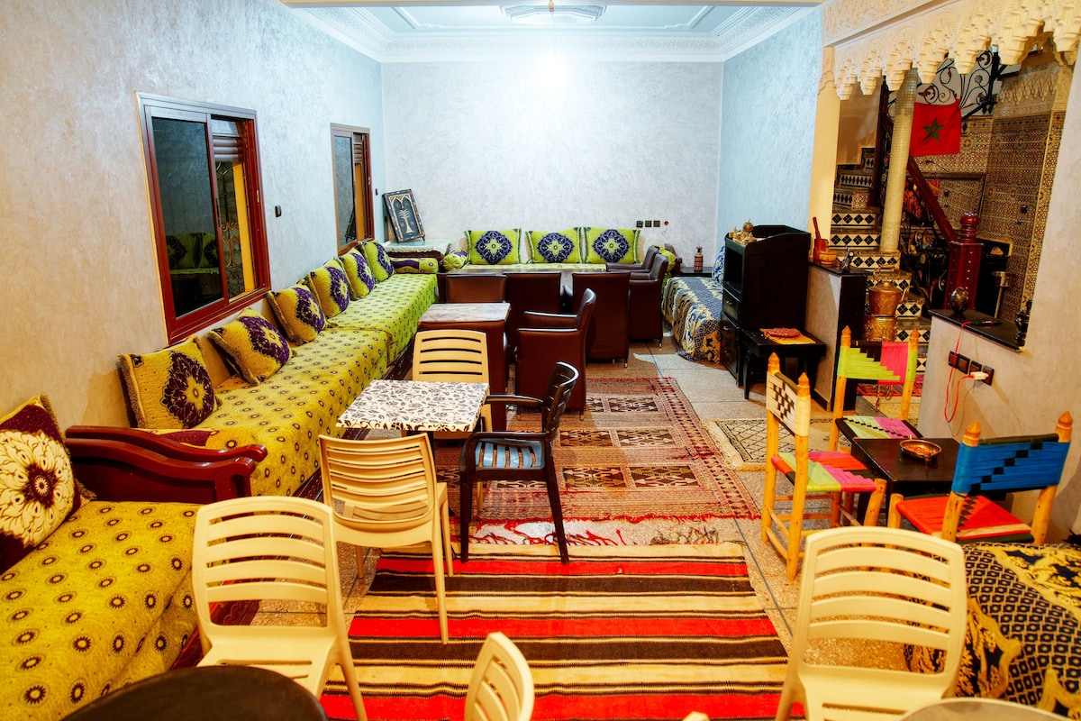 490 dirham pr. nat/person minimum 2 personer kapacitet 6 Morgenmad inkluderet Villa på 400 m², swimmingpool, pejsestuer, 3 soveværelser, 3 brusebadeværelser, køkken. Downtown 5 min. gang Wi-fi internet-tv Du vil elske denne unikke og romantiske ferie i raffinerede berberomgivelser. Mange små lounger giver dig mulighed for at slappe af, og poolen giver dig mulighed for at køle ned; Fred og ro i byens centrum Azizas diskrete tilstedeværelse gør dit ophold til en sjælden og unik ferie