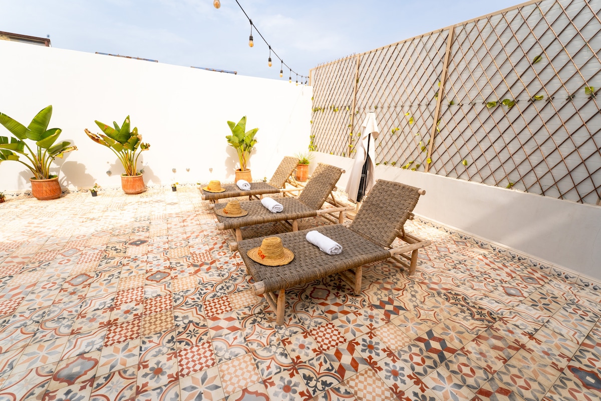 En gennemtænkt bolig til folk, der værdsætter moderne minimalisme og langsom, bevidst livsstil Denne bolig er jordnær, ryddelig og naturlig, og den får dig til at føle dig rolig, samtidig med at den tilskynder til kreativitet med store vinduer og naturligt lys Lejligheden ligger over Hey Yallah – højt vurderet på Google og den første specialcafé i Tamraght Lejligheden ligger også i samme bygning som StudiioHY, hvor der tilbydes en række workshops (yoga, keramik, kunst ...) @hey.yallah | @studiio.hy for begivenhedskalender