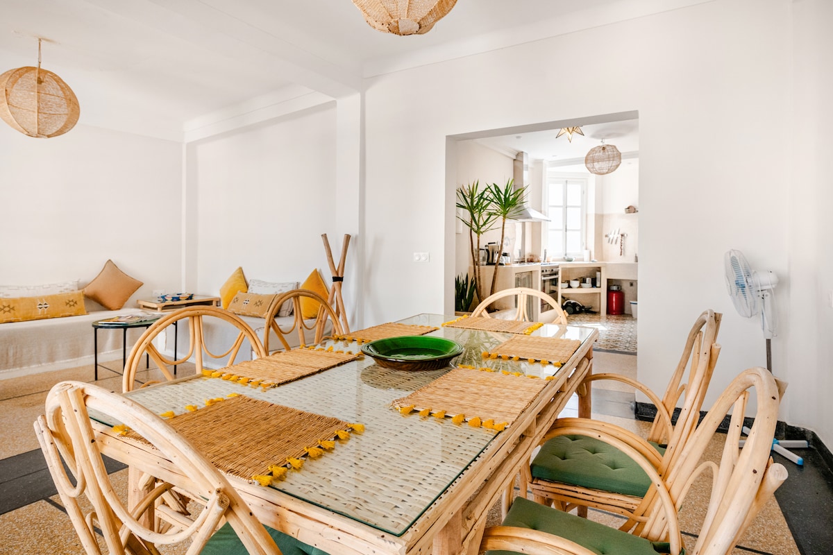 Vores familieriad ligger i hjertet af Tangiers medina, tæt på stranden, turistaktiviteter, museer, souks. Alt kan nås til fods. 5 minutter fra parkeringspladsen. Det er meget lyst og komfortabelt. Dens indretning, moderne og respektfuld over for den traditionelle arkitektur, dens udendørs områder og kvarteret vil forføre dig. Det er perfekt til familier og ophold med venner (spil- og musikrum med klaver). Den lejes eksklusivt: I vil være alene i boligen