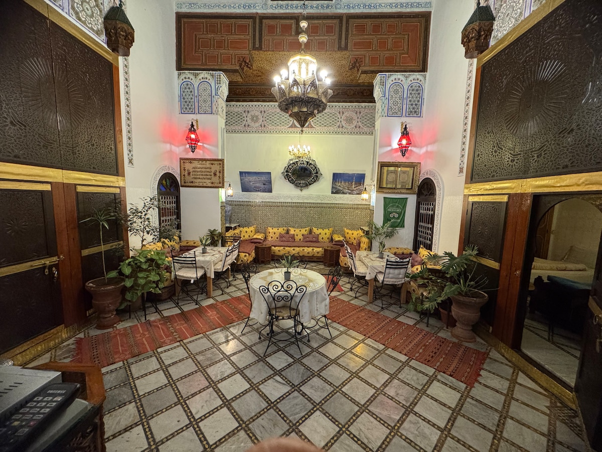Velkommen til vores traditionelle pensionat beliggende i hjertet af den gamle Medina i Fez. Dette restaurerede marokkanske hjem tilbyder et autentisk og fredfyldt ophold, kun en kort gåtur fra de vigtigste steder: Al Quaraouiyine-universitetet, de berømte garverier, Rcif-markedet og håndværkernes souker. Nyd charmen ved marokkansk arkitektur, personlig gæstfrihed og den perfekte beliggenhed til at udforske Fez' kulturelle rigdom.