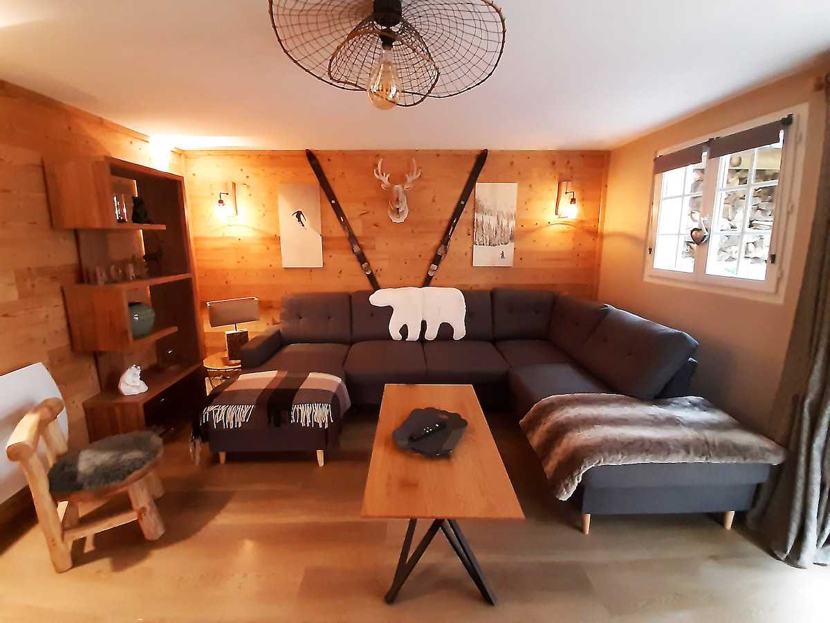 Behagelig lejlighed på 90 m2, fuldstændig renoveret. 3 soveværelser, 1 på 160, 2 på 140 og 2 små ekstra senge på 90 cm (barn) - indrettet køkken, stue, badeværelse, i stueetagen spille- og motionsrum, 15 minutter fra pisterne og 1 time fra havet.