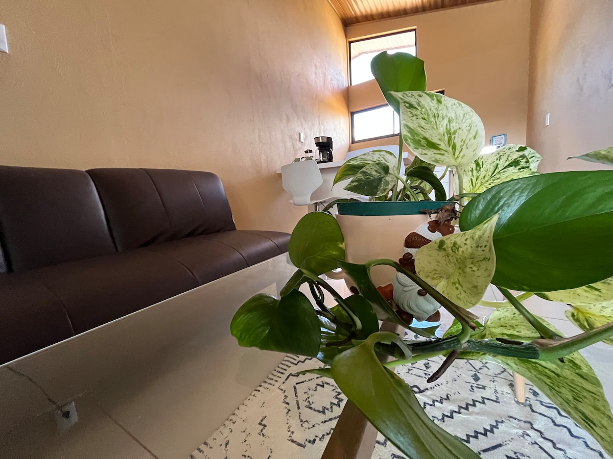 Privat atelier omgivet af natur, perfekt til et fredeligt og behageligt ophold. Har et udstyret køkken, privat badeværelse, 2 senge (1 queensize, 1 dobbeltseng), aircondition og varmt vand. Vågn op med din morgenkaffe, og nyd den frodige grønne udsigt, hvor du måske kan se aber, tukaner og lokale vilde dyr. Beliggende 5 minutter fra hospitalet, 15 minutter fra Quepos centrum og 20 minutter fra strande, vandfald og nationalparker. Inkluderer sikker parkering, nem adgang og offentlig transport hvert 30. minut