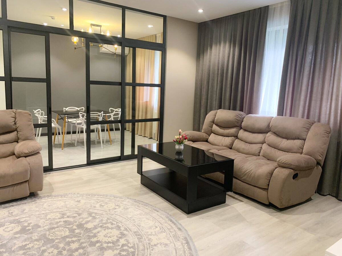 Dette er en rummelig og komfortabel serviceret lejlighed med døgnåben sikkerhed på stedet. - Fremragende beliggenhed (nær den berømte Ganga-is) med Gafur Gulom-metrostationen, dagligvarebutikker, butikker og restauranter i nærheden - Gratis adgang til det veludstyrede fitnesscenter på Medion Sport, der ligger i samme bygning - Gratis daglig rengøring - Gratis parkering på stedet