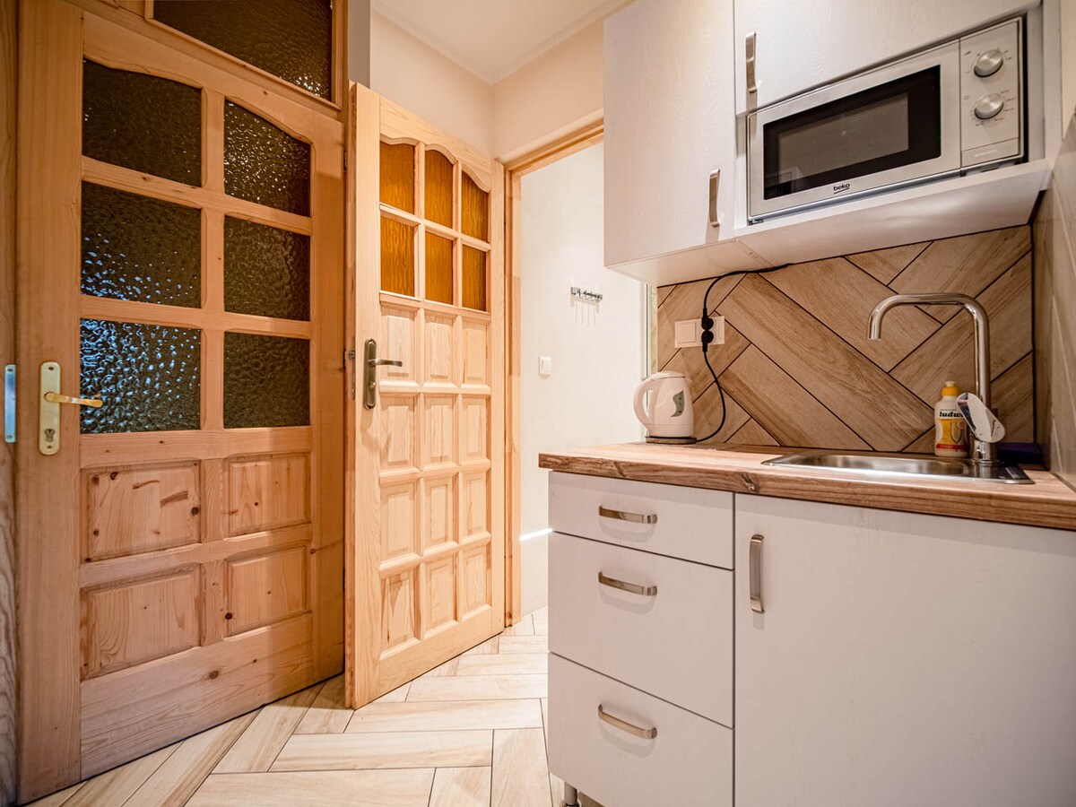 Lejligheden ligger i byens centrum (5 minutters gang fra Krupówki - byens vigtigste gågade), men ligger på en stille, afsondret gade. Lejligheden er behagelig og varm med en let retro atmosfære, der skyldes detaljerne i design og afsløring inde i de originale trævægge. Perfekt til par, der leder efter et hyggeligt sted eller som base for at udforske de lokale attraktioner og bjerge omkring Zakopane.