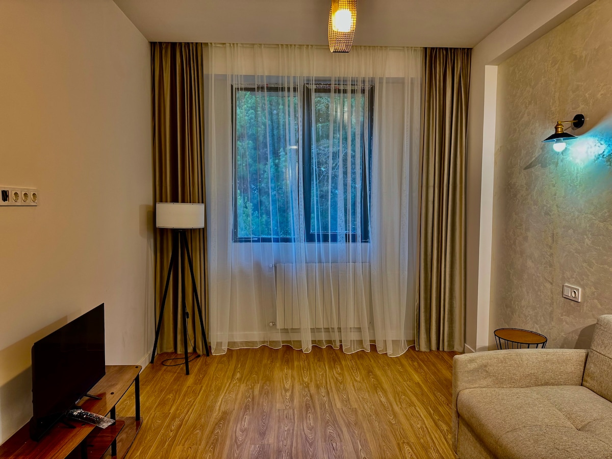 Velkommen til vores familievenlige, fredelige lejlighed i centrum. Vores hyggelige og fuldt udstyrede bolig er perfekt til familier. Kun få skridt fra vores lejlighed ligger den smukke park "Mziuri". Altan med en fantastisk udsigt over parken, så du kan nyde det smukke landskab, mens du drikker din morgenkaffe eller nyder et glas vin om aftenen. Vi byder din bedste lodne partner hjerteligt velkommen i vores bolig! Book hos os, og oplev den perfekte ferie!