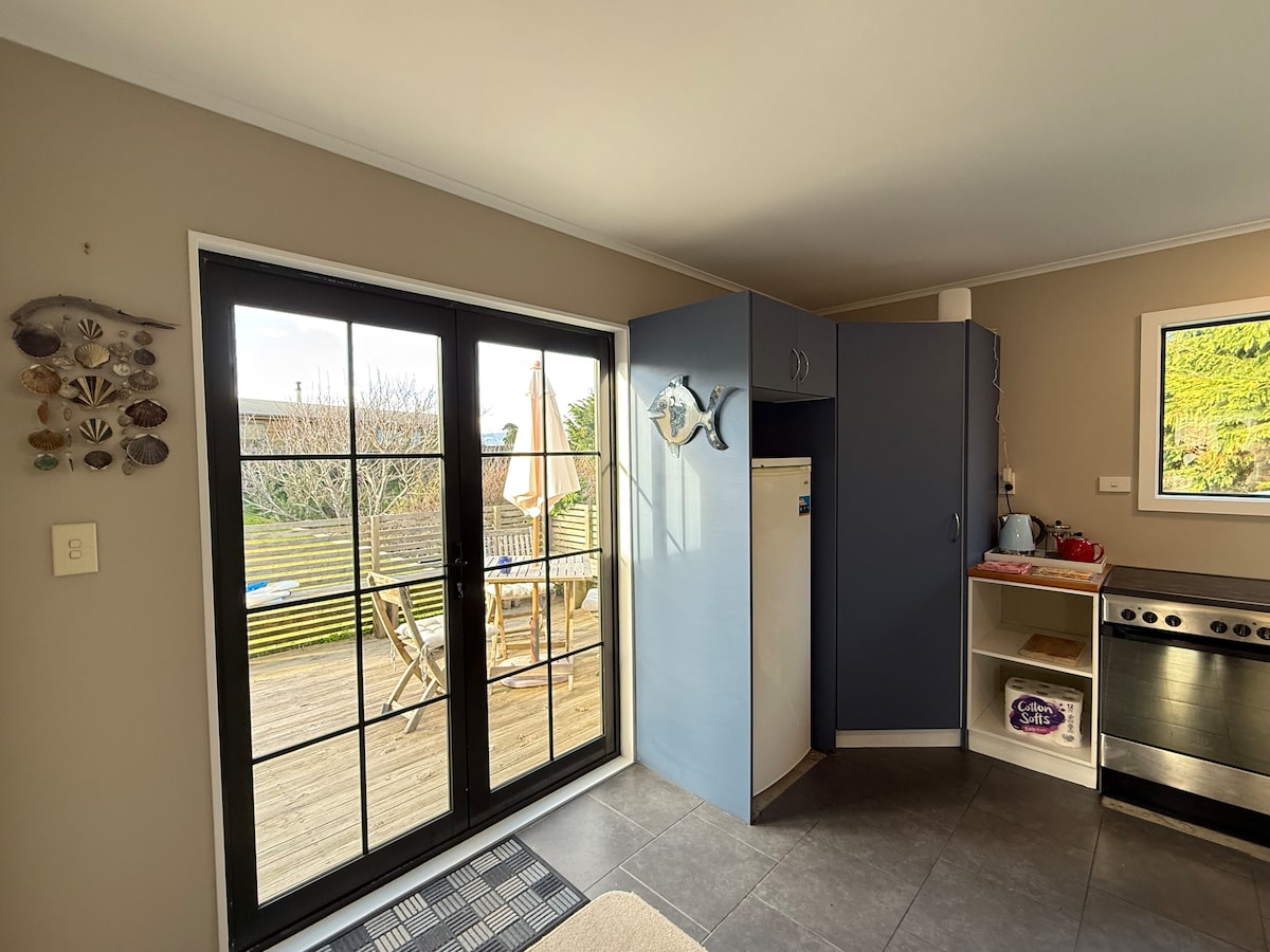 Comfy Kiwi bach one block back from the beautiful & quiet Te Horo beach. Fully fenced garden, great for kids or pets. Modern kitchen complete with dishwasher. Heatpump to keep the whole house warm. Recently decorated & updated. Two separate bedrooms, one with a comfy queen bed & the other with two singles. Both have bedside cabinets and drawer storage. Sunny, fully fenced section with a swing & pirate boat to keep the kids entertained. Spacious deck for alfresco meals & relaxing in the sun.