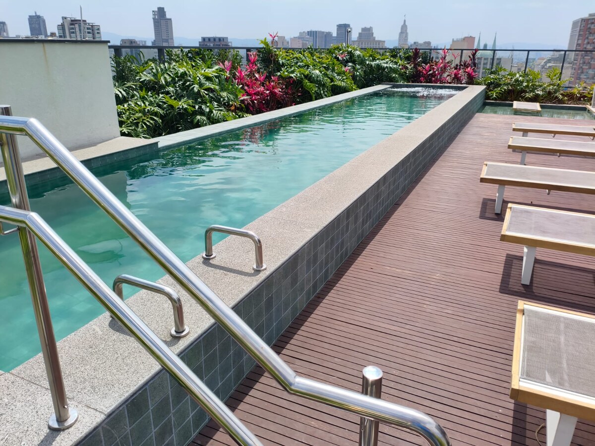 Vidunderligt ophold i en hyggelig og charmerende lejlighed med terrasse og udsigt. Super godt beliggende, højhastigheds wi-fi, 42" tv og aircondition. Infinitypool på taget, kontorfællesskab og fitnessrum til rådighed. 350 m fra metroen og tæt på kultur, gastronomi, natteliv, supermarked, apotek og butikker. Tæt på Praça da Sé, Farol Santander, Mario de Andrade-biblioteket, Pátio do Colégio og det kommunale teater. Concierge med sikkerhedsvagt døgnet rundt.