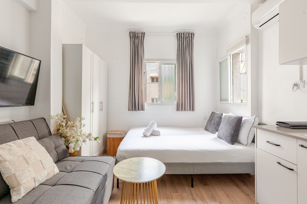 Opdag et unikt studie på Kikar Atarim-pladsen. Denne tidligere kommercielle bolig er blevet hyggelig lejlighed i modsætning til alle andre. Nyd bekvemmeligheden med et nærliggende supermarked, og nyd solen på stranden. Dyk ned i det pulserende natteliv kun få skridt væk. Dette er ikke din typiske lejlighed – det er en unik perle i hjertet af pladsen.