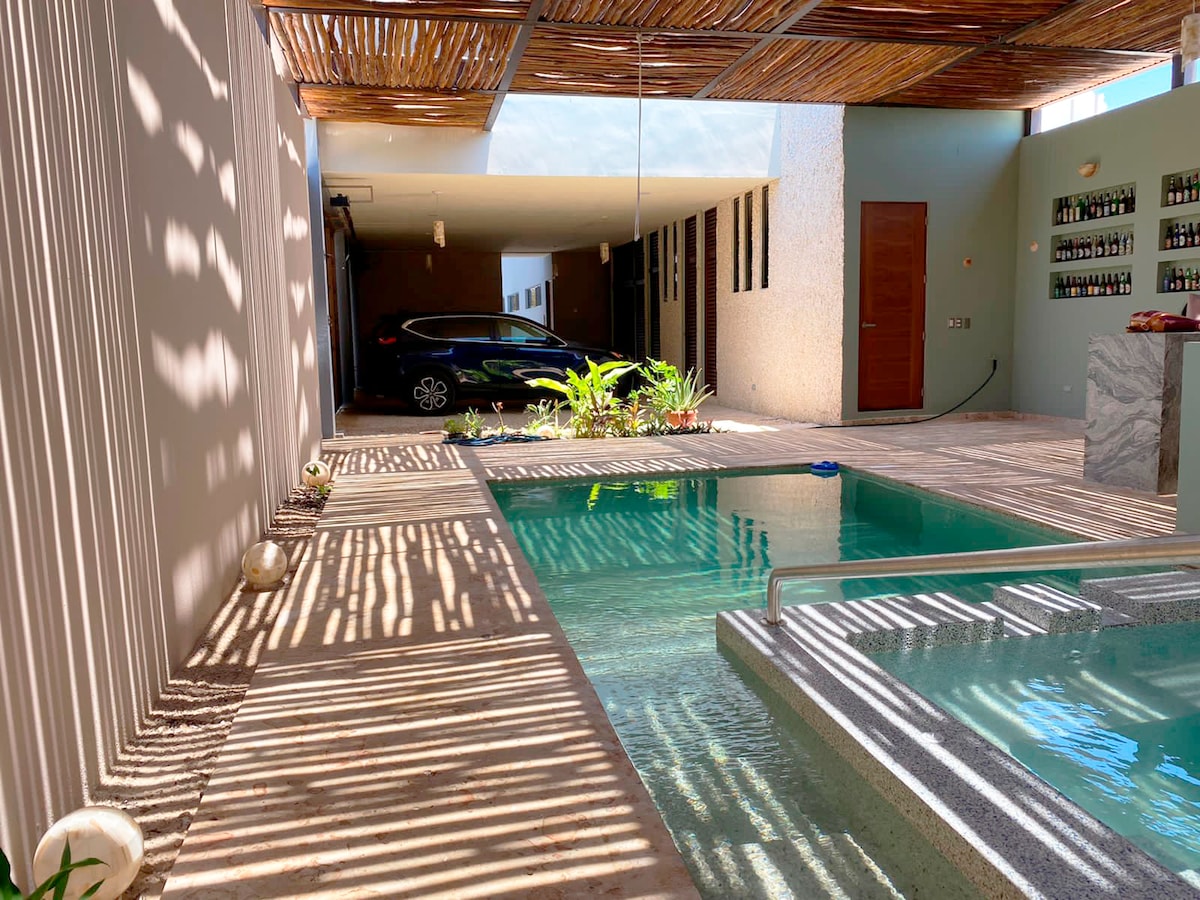 Casa María er en privat bolig med en privat pool, ideel for dem, der søger hvile og privatliv i fredelige omgivelser uden fællesområder. Beliggende 3 blokke fra stranden i Telchac Puerto og tæt på byens centrum, restauranter og strandklubber. Den har pool, bar, grillområde, hængekøje, udendørsbruser, tagterrasse med havudsigt, soveværelse, udstyret køkken og komplet badeværelse. Et fredeligt sted, hvor du kan nyde Telchac i dit eget tempo.