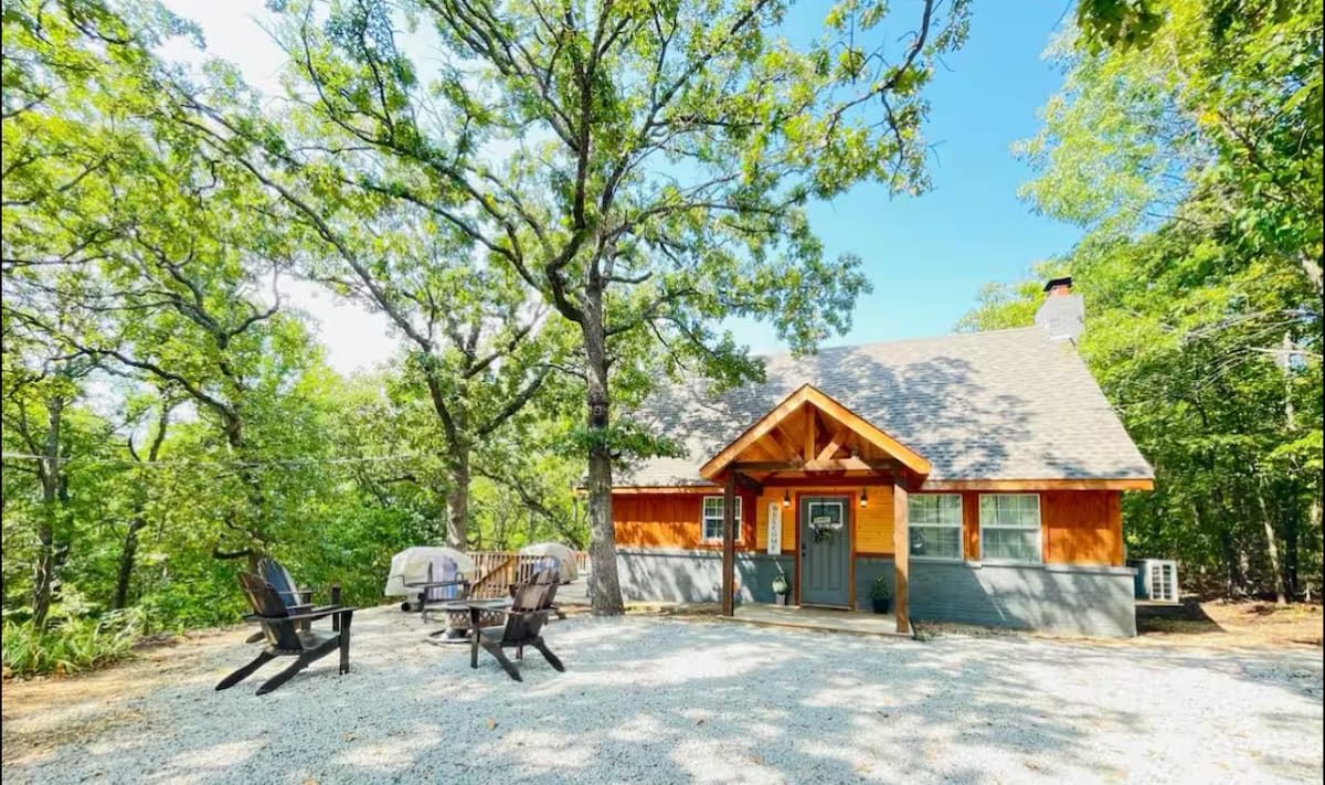 Kom væk fra det hele i denne charmerende hytte beliggende blandt træerne ved smukke Lake Tenkiller, en mile fra en gratis bådrampe. Slap af på terrassen, eller nyd s'mores omkring bålstedet efter en dag på søen, dykning eller flydende på Illinois River (øvre halvdel). Fisk efter regnbue- og bruneørred året rundt (nederste halvdel). 2 Wildlife Managements til jagt, i Cookson & Tahlequah (har en skydebane). Smukke efterårsfarver i vores område. Tæt på restauranter/butikker. Rabatter for længerevarende ophold