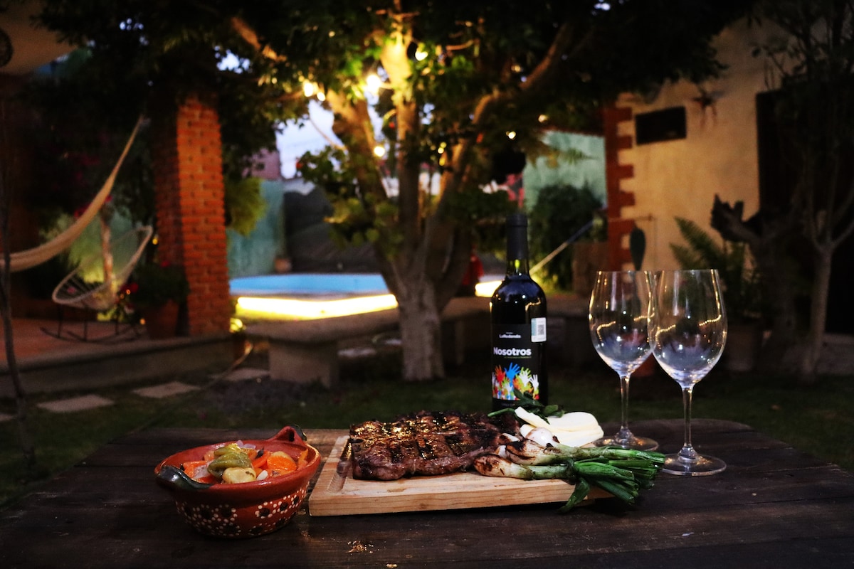 Smukt og komfortabelt hus i mexicansk stil. Til 8 personer, beliggende 10 minutter i bil fra centrum af Tequis, 30 minutter fra Peña de Bernal og 20 minutter fra forskellige vinmarker. Opvarmet 7x4-pool med privat solsystem kun til dig. Grill, bålplads, pejs (inkluderer ikke træ eller kul), springvand, jacuzzi, udstyret køkken, wi-fi, 50" 4K smart-tv og kabel-tv, NETFLIX, YouTube. Vi accepterer 2 mellemstore kæledyr mod et gebyr på 300 dollars (registrer dem i APPEN)