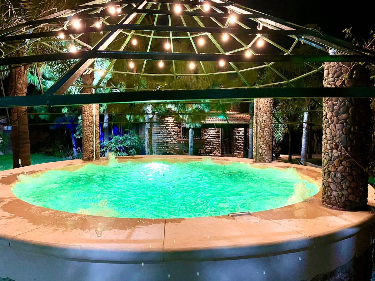 Casa Dharma er ideel til store grupper i Tequisquiapan. Med kapacitet til 22 gæster (2 soveværelser i hovedhytten og 3 udendørs bungalower) kan du nyde en privat pool, opvarmet jacuzzi, projektor, karaoke, bordtennisbord, lejrbål og stor have, der er perfekt til familiesammenkomster, retreats eller intime bryllupper. Kun 1,5 km fra centrum, kombinerer den privatliv, komfort og sjov. Udstyret køkken, terrasser og sociale områder designet til at skabe unikke minder med dem, du elsker mest.