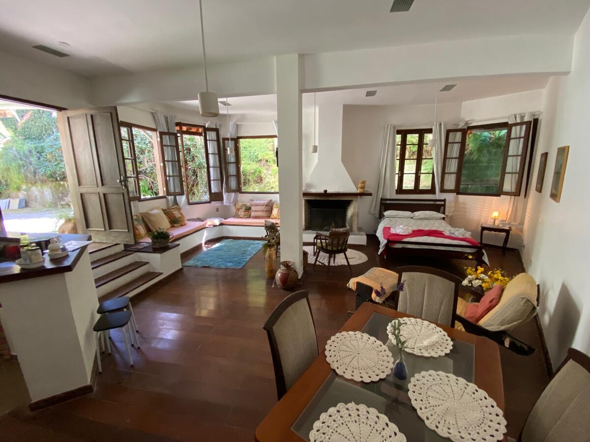 Et loft/studie beliggende i et anneks til hovedhuset (edikel), roligt, lyst, med uafhængig indgang, på en stor ejendom, hvor du sover og vågner op til lyden af fuglene. Tæt på butikker, busstoppested, restauranter, vandfald, stier, hvor du kan nyde naturen, og få afslappet krop og sind. Jeg vil altid være til rådighed for at opfylde de ekstra behov, der er inden for min rækkevidde, og for at give vejledning om udflugter. Velkommen til paradis! Du kan også få adgang til @aconchegotere med flere oplevelser.