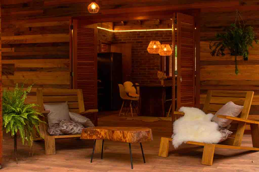 Hyggelig hytte, der er ideel til dem, der ønsker fred og ro og kontakt med naturen, men uden at opgive komfort. Den kombinerer det rustikke med det sofistikerede, med eksklusive møbler lavet af træ under byggeriet, men også med boblebad og gasbruser, queensize seng, aircondition, wifi og køkken. En luksusuriøs indkvartering midt i naturen. Den ligger på toppen af Zuckerhut-bakken i Ano Bom i Colinas/RS. Fra terrassen kan du nyde en fantastisk udsigt over dalen og solnedgangen.