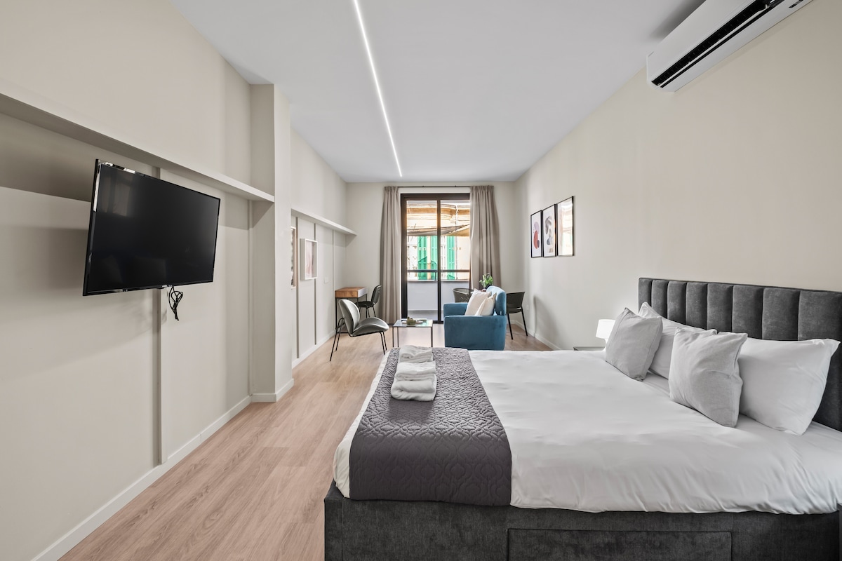 Lys og rummelig studiolejlighed i Nicosias gamle bydel Denne stilfulde studiolejlighed på første sal har en super kingsize-seng, en hyggelig læsekrog og et tekøkken med Nespresso-maskine. Et kæmpe vindue fylder rummet med naturligt lys med udsigt over fodgængervejen. 🌇 Højdepunkter: ✔ Rummelig og lys med en afslappende krog ✔ Spise-/arbejdsbord og hurtig wi-fi ✔ Smart-tv og aircondition ✔ Indtjekning uden vært + velkomstgodbidder Ideel til par, forretningsrejsende og digitale nomader.