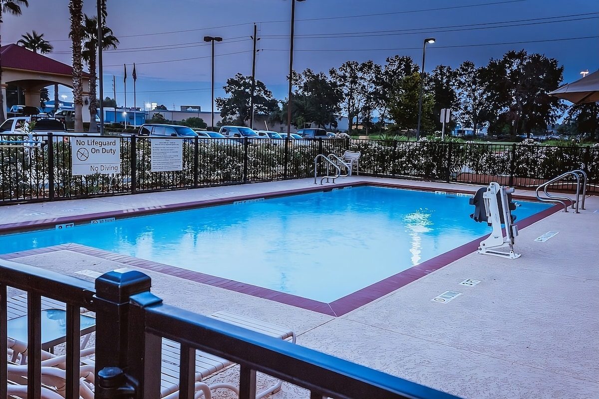 To senge hotelværelse med fuld adgang til hotellets faciliteter såsom pool, fitnesscenter og udendørs grill. Praktisk beliggende i nærheden af en lang række chauffører, herunder Texas Children's Hospital West Campus, HCA Houston Healthcare West, Memorial Hermann Memorial City Medical Center, West Oaks Mall, Town & Country Village, Houston Chinatown, Memorial City Mall og City Centre Plaza. Rengøringsgebyret omfatter engangsrengøring efter udtjekning og ugentlig rengøring for længerevarende ophold.