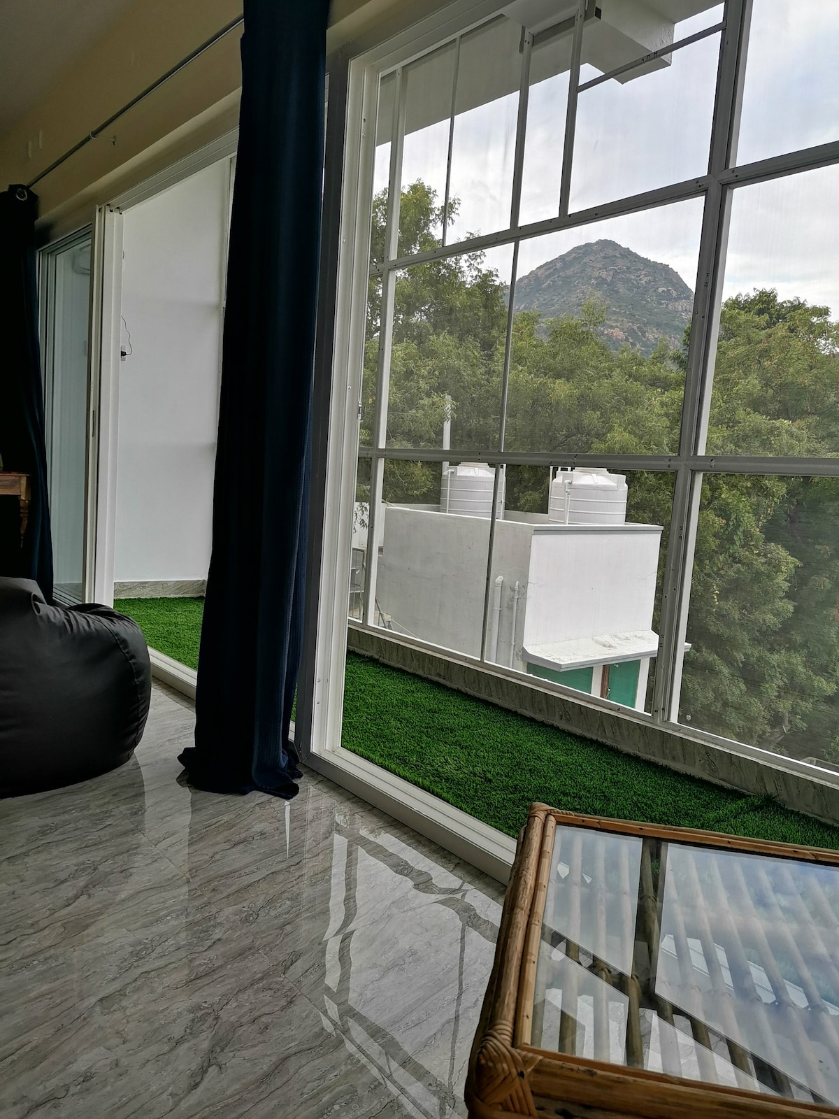 Find spiritual bliss in this 3rd-floor retreat, just 10 mins walk (600 Metres) from Sri Ramanasramam and Yogi Ramsuratkumar Ashram. Unobstructed, wide-glass views of Arunachala mountain offer a profound spiritual connection. Aesthetically designed with modern comforts and a bamboo sofa in corridor for meditation, a peaceful sanctuary in Tiruvannamalai. Only stairs to improve your health (No Lift)