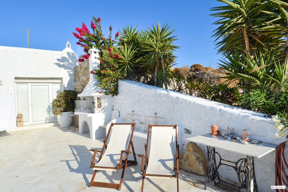 En nyrenoveret dejlig og rolig studiolejlighed på 20 m2 med havudsigt. Stedet ligger kun 1,5 km fra Paranga Beach & Scorpios og 4,5 km fra landsbyen Mykonos. Stor terrasse med pergola. Lille udendørs tekøkken og udendørs spiseområde, hvor du kan få en god middag eller et glas vin på den hyggelige indbyggede sofa under stjernerne i Mykonos. Stedet er orienteret sydpå, så Mykonos' nordlige vinde forstyrrer slet ikke!