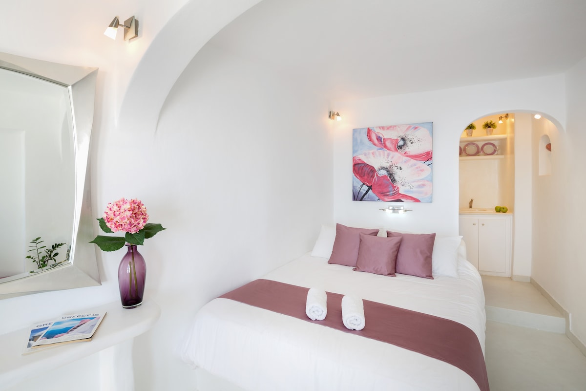 Aspa Caves's Traditional studio, located at Oia's cliff at a very quiet area. The studio is ideal for honeymooners and for those who imagine some very special moments in Santorini. It features an outdoor private jacuzzi, a bedroom with a queen size bed (160 x 200cm), a siting area with a traditional sofa bed, dining table, kitchenette and a bathroom with shower. It also features it's own small balcony with amazing views of the Caldera gulf, volcano and Thirasia island. Size: 30 square meter