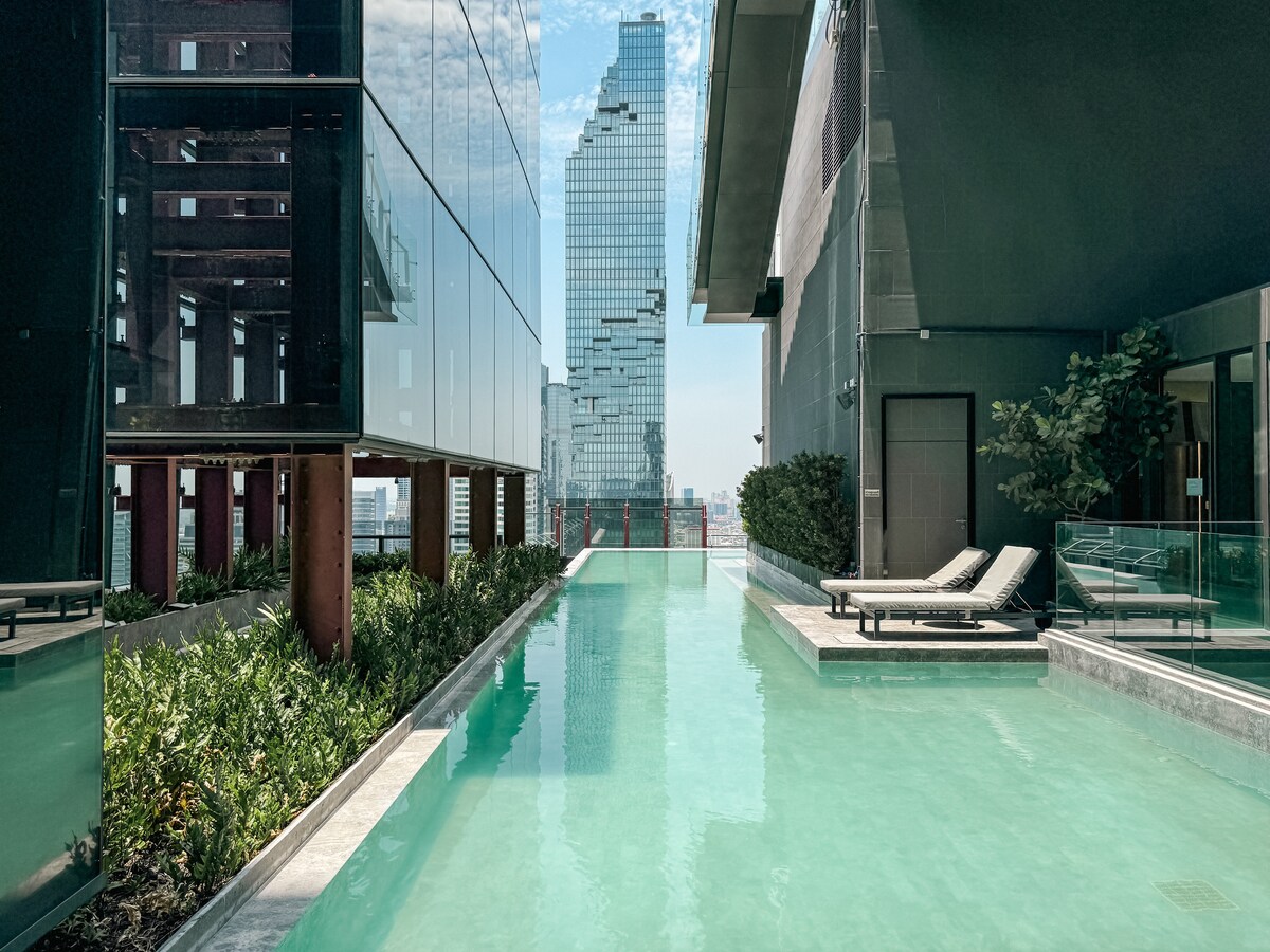 Oplev Bangkoks hjerterytme lige uden for døren Madboderne summer nedenunder, templerne står stolt, kanalerne flyder med lokalt liv. Synk ned i din ortopædiske memoryskumsseng, nyd det uberørte badeværelse, drik kaffe på din private balkon, mens du ser tempeltårne og poolen glitre nedenfor. 55" tv klar. Metro få skridt væk, udforsk alt ubesværet. Kom hjem til 5-stjernede faciliteter: infinity pool, fredelig tagterrasse, moderne fitnesscenter, afslappende sauna. Det er ikke bare et ophold, det er Bangkok-oplevelsen