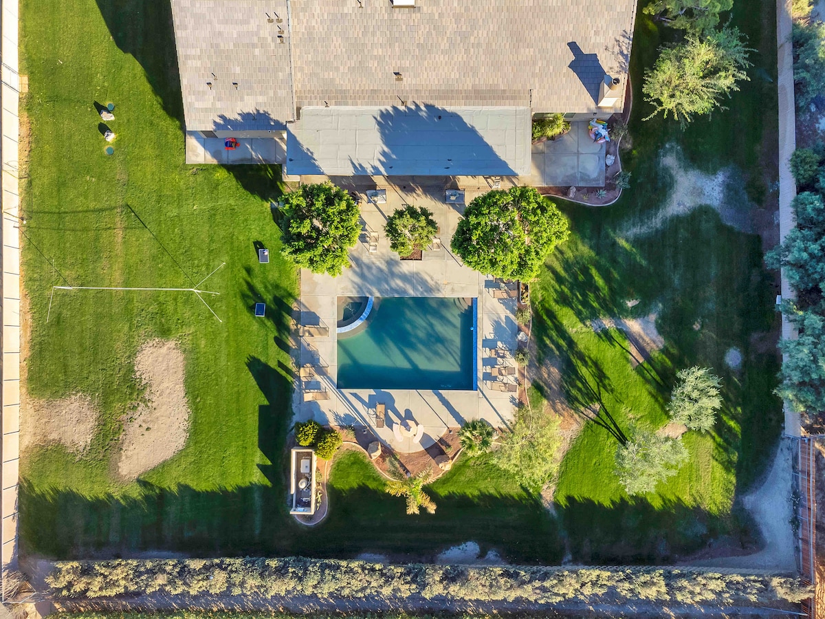 Denne smukke moderne hacienda-bolig har smukt anlagt grund på to hektar med udsigt over bjergene. Hvis nogen i din gruppe elsker sport, er der masser af græsområder til fodbold, volleyball og basketball (net og bolde er til rådighed). Denne rummelige bolig har 5 soveværelser med 8 senge. Det er også centralt beliggende mellem Palm Springs, Indio og Palm Desert uden støj og travlhed i byen og alligevel inden for 3 miles til Walmart og Costco og få minutter til alle spisesteder på El Paseo.