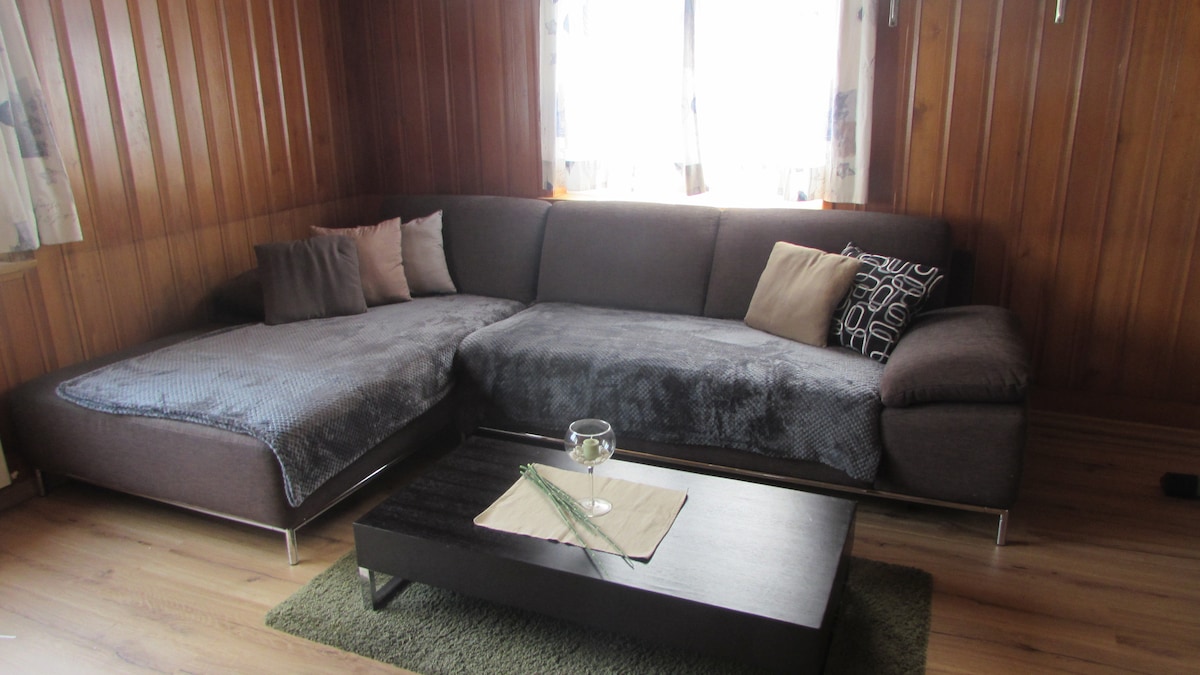 Lejligheden Loghomespace ligger på husets nederste etage. Den er kærligt indrettet og har alt, hvad du skal bruge til et ophold i en feriebolig. Bjælkehytten ligger på Haselbachhof, som drives af vores familie i 3. generation. Regionen kaldes også Mostindien på grund af de mange æbletræer. Der er 450 træer på Haselbachhof samt 40 malkekøer, 10 Angus-mødrekøer, 10 heste, et par får, katte og hunde.