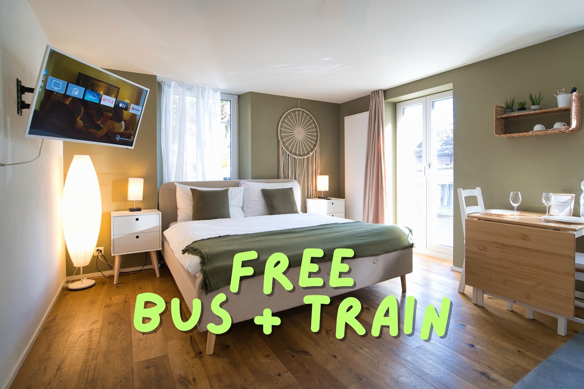 Denne moderne studiolejlighed ligger tæt på søen (3 min.) og tilbyder et rent og jordnært design. Det fuldt udstyrede køkken, det separate badeværelse med brusebad og den hyggelige stue/spisestue samt den komfortable dobbeltseng inviterer dig til at slappe helt af og nyde dig selv. Ermatingen er en malerisk fiskerby med smukke vandreruter, et par restauranter og cykelvejen lige foran huset. Vi tilbyder sikker parkering i vores garage til 1 bil.