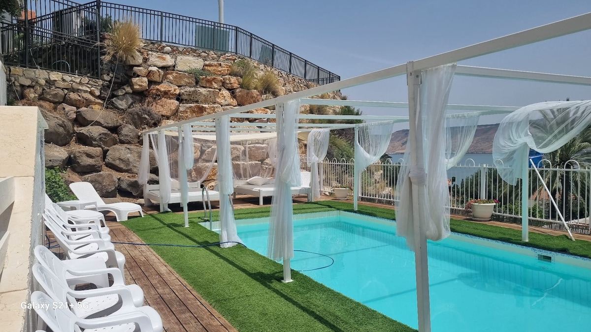 Velkommen til Magdala Suite – en luksuriøs oase med en jetstrømspool og en fantastisk udsigt over Arbelbjerget og Genesaretsøen. Suiten har en hyggelig stue med en foldbar sofa, et fuldt udstyret køkken, et soveværelse med balkon og eget badeværelse, et ekstra soveværelse og en terrasse med en privat pool Ideel til par og familier, der søger komfort og afslapning i det nordlige Israel. Nyd fredelige morgener, frisk luft og rolige omgivelser få minutter fra Galilæa for et ægte Galilæa-ophold