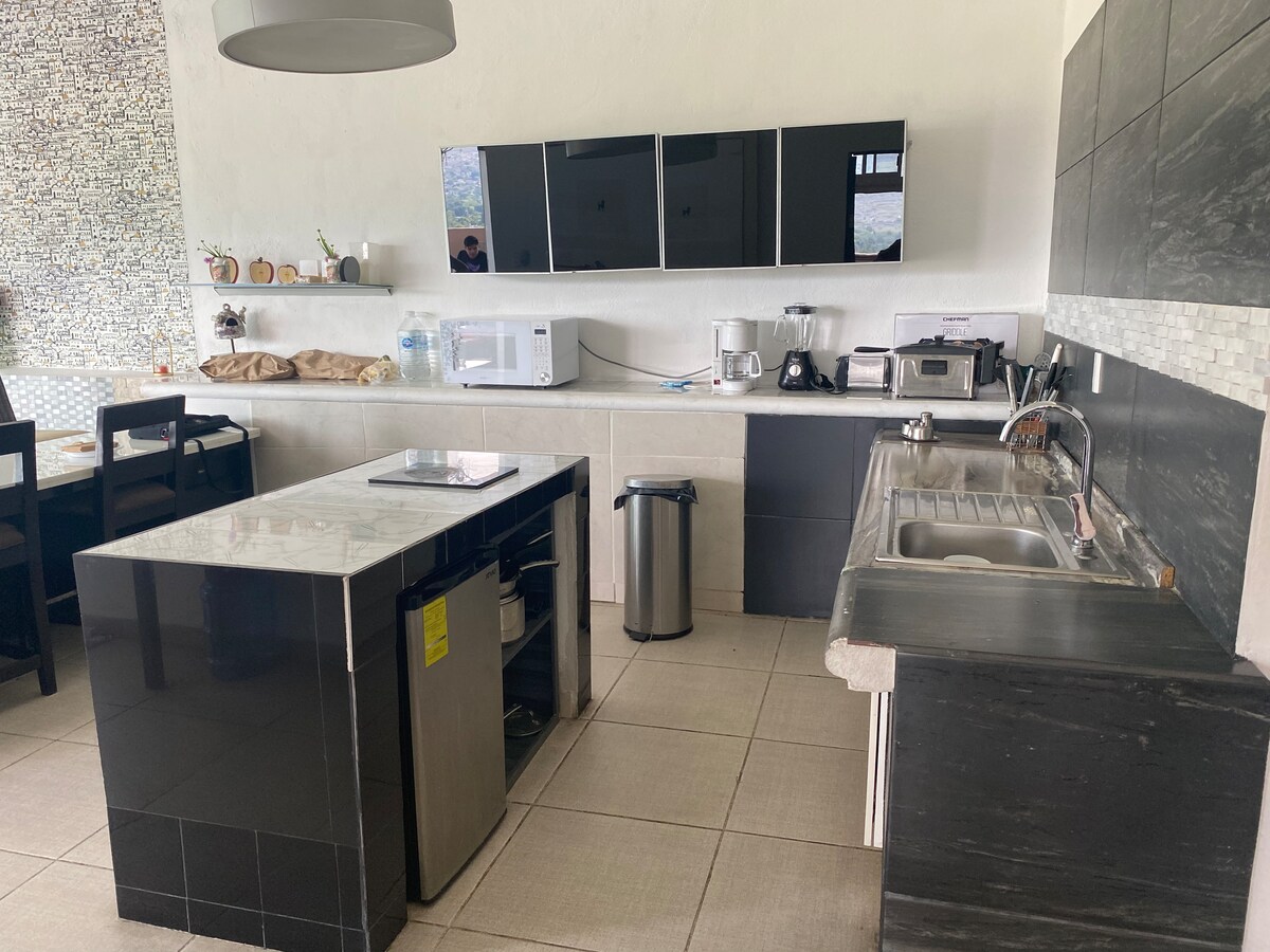 Kom og nyd dette smukke ophold med en privilegeret udsigt over et økologisk reservat, hvor du kan observere kaniner,ræve, heste, høge og andre dyr. Kun få minutter fra et af de mest paradisiske steder i Morelos: Naturparken "Las Estacas" samt den magiske landsby Tlaltizapán de Zapata. Den har 1 queensize-dobbeltseng og en behagelig familiefuton. Der er et tekøkken med mikrobølgeovn, airfryer og et lille køleskab. Der er badeværelse og tv og internet.