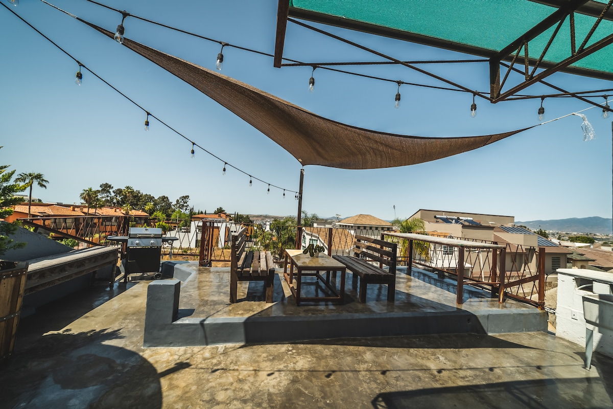 Elegant loft med betonvægge, stålbjælker og træoverflader og en botanisk stemning, der maler en frisk og industriel stil. I soveværelset har du en kæmpe udsigt over Tijuanas mest historiske gade. Gå op ad tagterrassen for at nyde en koncert og udsigt over gaderne ved siden af en bålplads. Døgnåben sikkerhed og adgang kun med kort. Oplev Tijuanas mest centrale beliggenhed, hvor klinikker, supermarkeder, barer, restauranter og caféer ligger mindre end fem minutters gang væk.