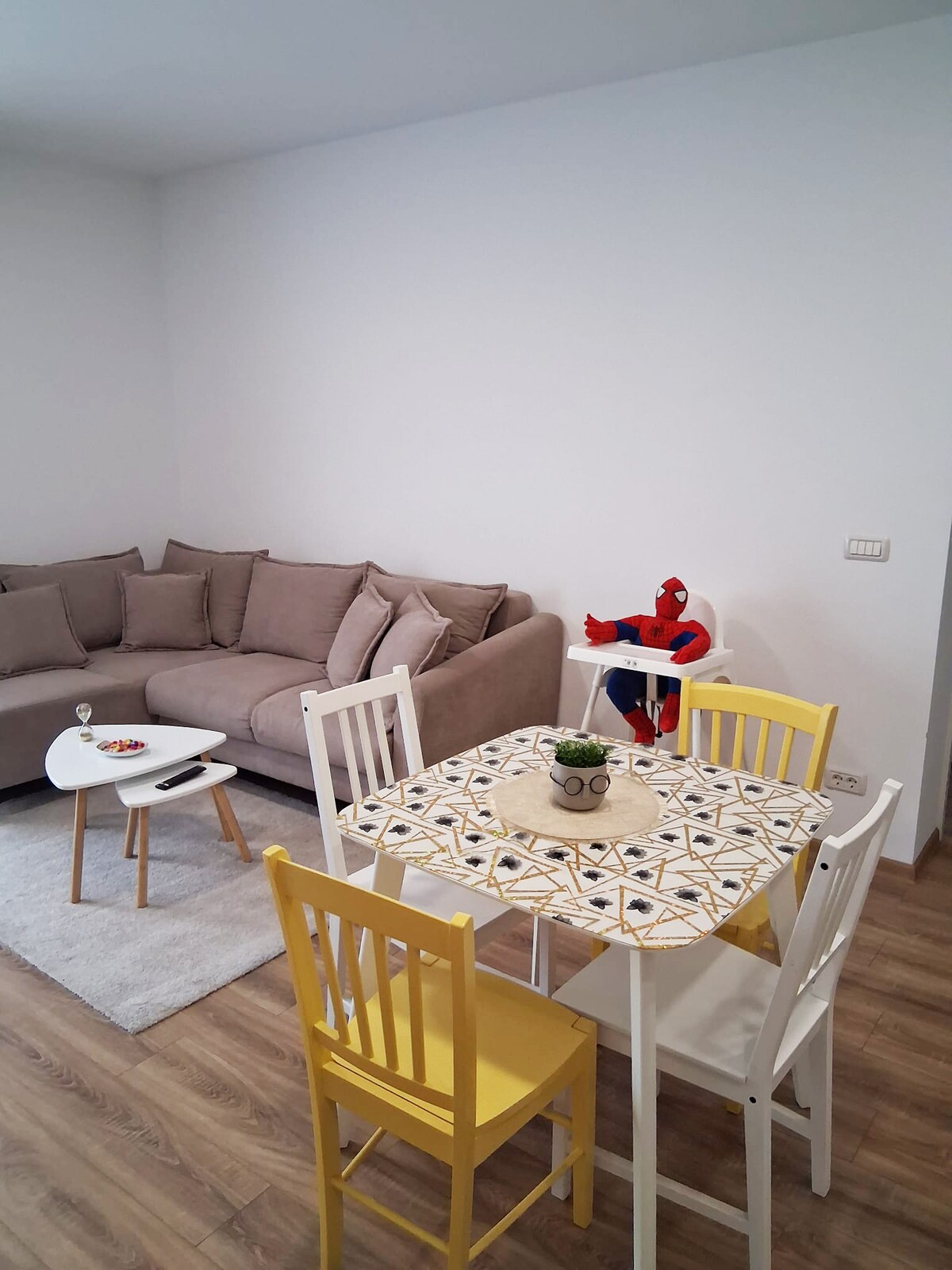 Ny, lys lejlighed i moderne design og gratis parkering. Det er placeret ved indgangen i Timisoara, i nærheden af Esso tankstation. Lejligheden er udstyret med: - etage fuldt udstyret med det nødvendige: elektrisk komfur, ovn, ovn, opvaskemaskine, køleskab, køleskab, kaffemaskine og service. - Åbent rum, hvor gæsterne kan nyde en film, på en behagelig sofa, på et Smart-tv, på et Smart-tv - soveværelse med kingsize-seng - mel med brusekabine og vaskemaskine med tørretumbler.